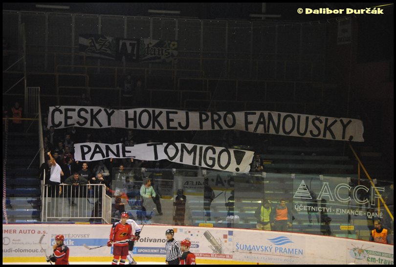 Šedesátka havířovských v prostějovském sektoru pro hosty roztahuje toho dne několik transparentů, jedním z nich je i „Český hokej pro fanoušky, pane Tomigo“, reagující na dvojnásobné vstupné pro příznivce hostů. Zvednutý prst našeho spíkra značí gesto vůči domácím, kteří se také ohradili proti tomuto kroku…